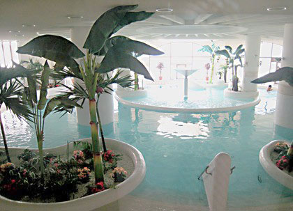 バーディハウス(屋内温水プール)。南国風の木々があしらわれており爽やかな空間です。